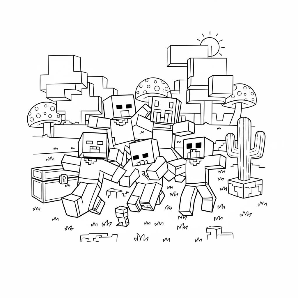 Divirta-se colorindo este desenho de Minecraft com personagens icônicos e elementos do jogo!