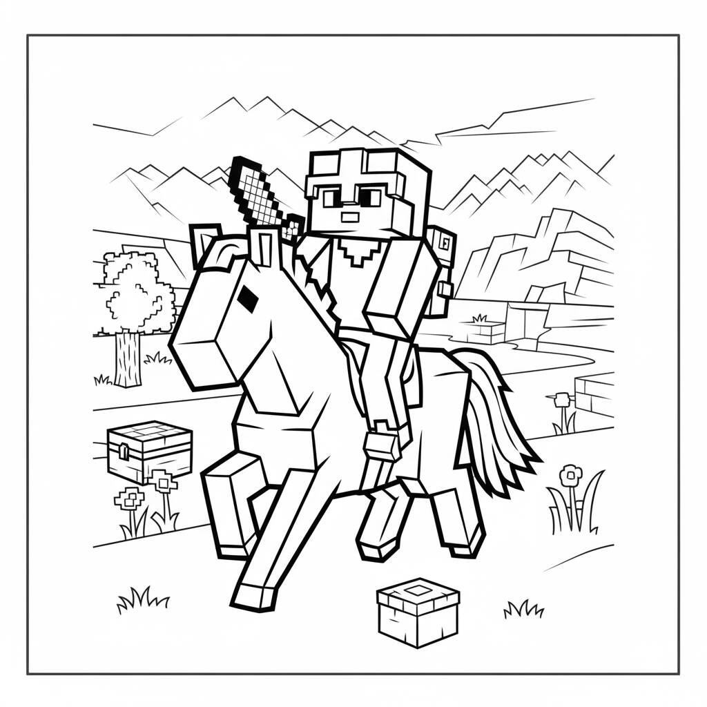 Uma divertida página de colorir do tema Minecraft, apresentando um cavaleiro em um cavalo, perfeita para os fãs da franquia.