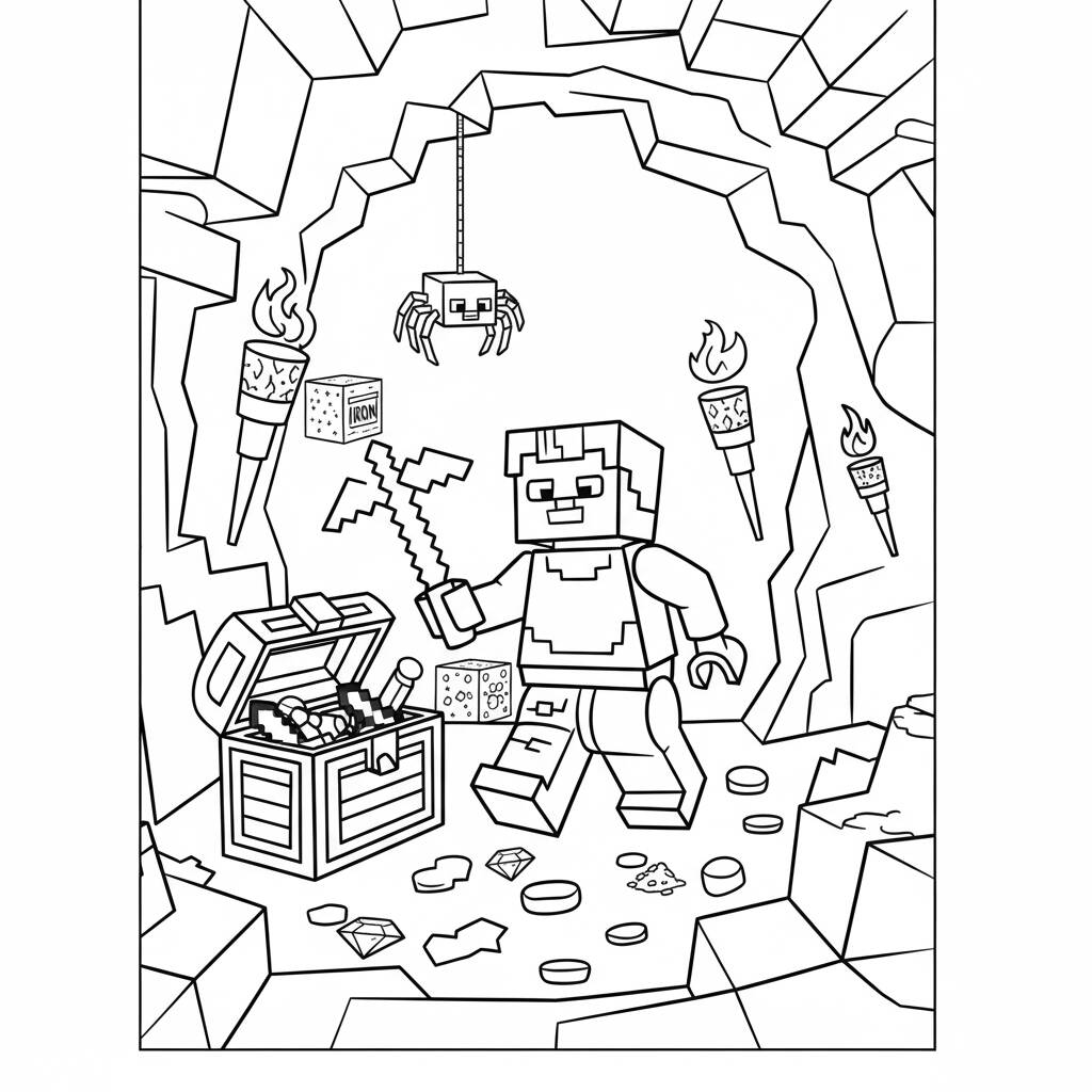 Uma divertida página de colorir temática de Minecraft, apresentando um personagem minerador em uma caverna cheia de tesouros e criaturas.