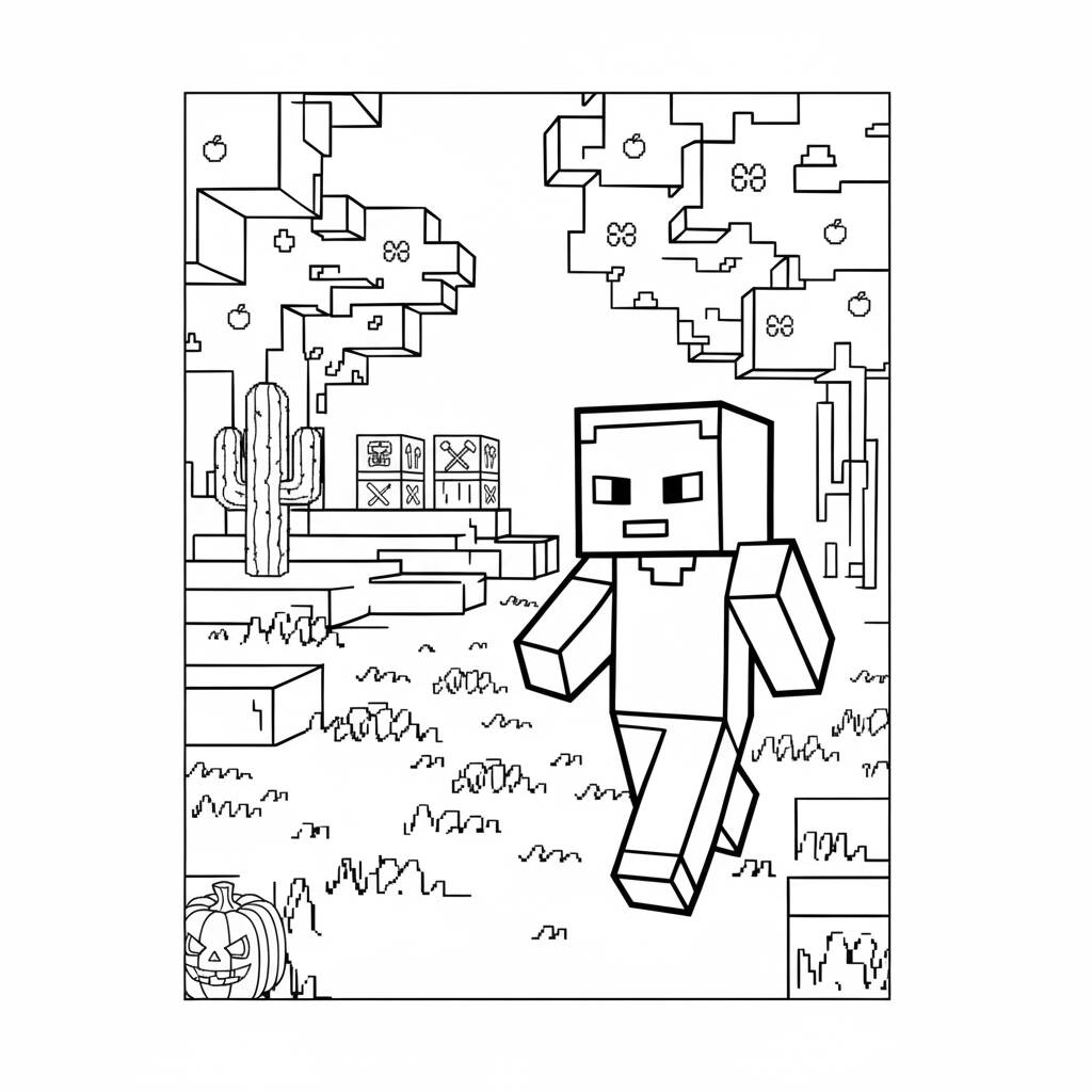 Página de colorir temática de Minecraft com um personagem em um ambiente de jogo.