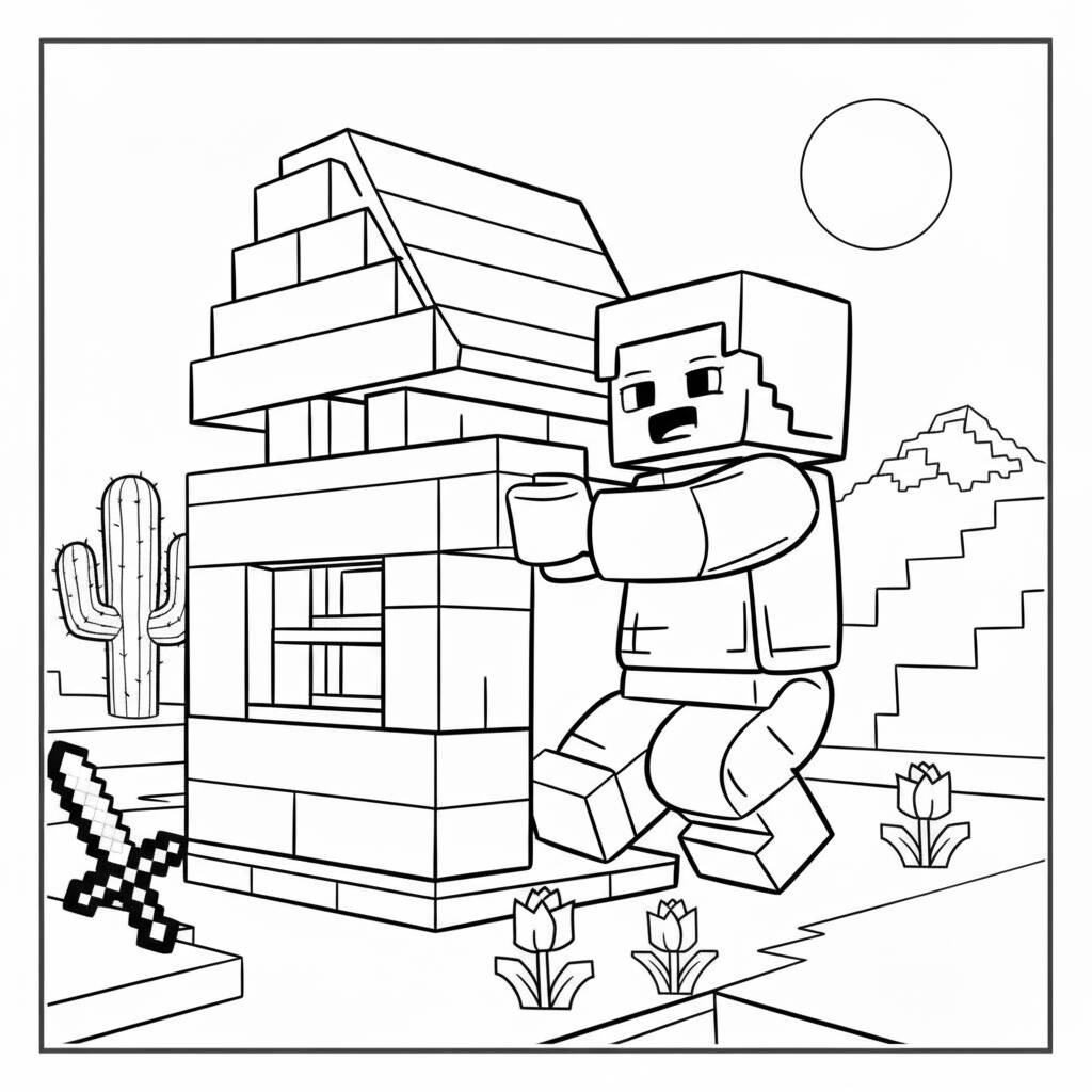 Uma divertida página de colorir com um personagem de Minecraft pulando em frente a uma casa, perfeita para fãs do jogo.