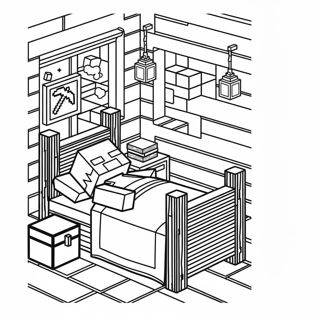 Página de colorir temática de Minecraft mostrando um quarto aconchegante.