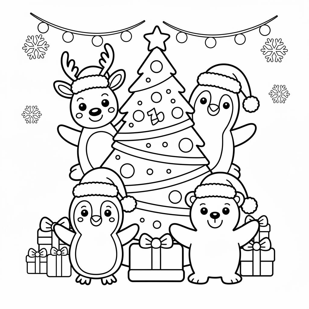 Uma divertida página para colorir com animais adoráveis celebrando o Natal ao redor da árvore.