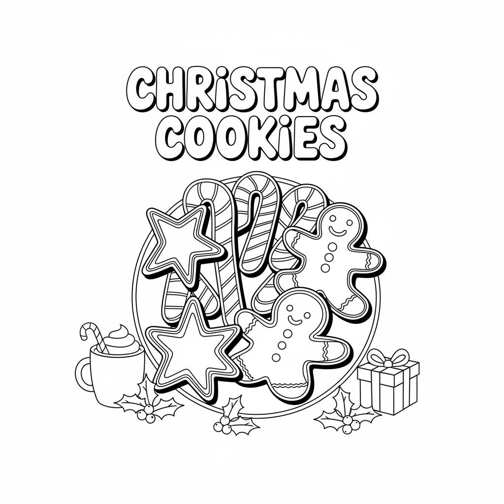 Uma divertida página de colorir com biscoitos de Natal, incluindo estrelas e bonequinhos de gengibre, perfeita para as festividades.