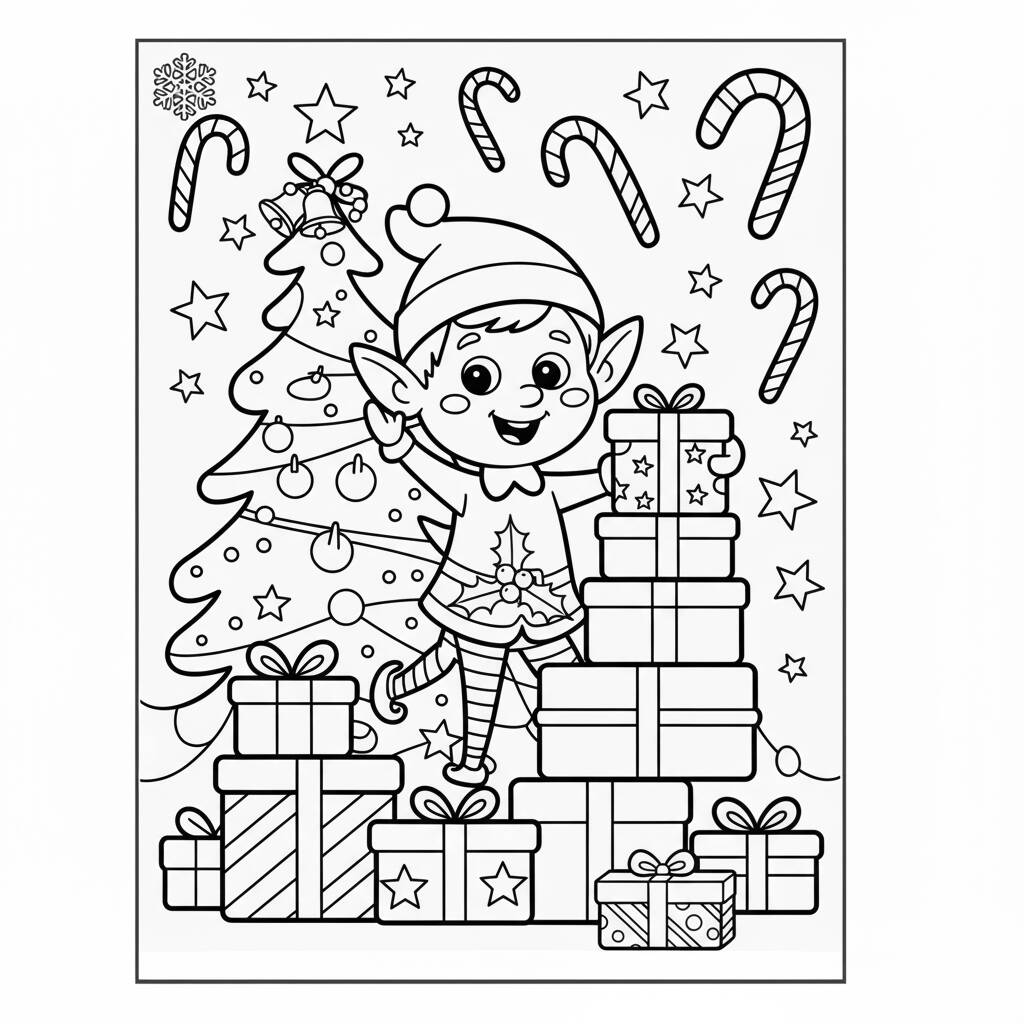 Uma divertida página de colorir de Natal com um elfo animado cercado por presentes e uma árvore de Natal.
