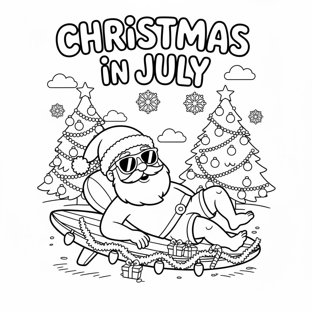 Divirta-se colorindo este desenho divertido do Papai Noel relaxando em julho, rodeado por árvores de Natal e enfeites.