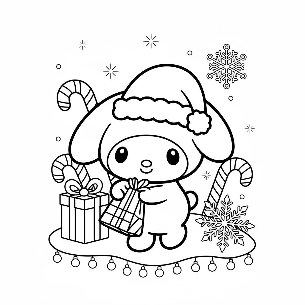 Página de colorir natalina com um adorável personagem segurando presentes, ideal para crianças.