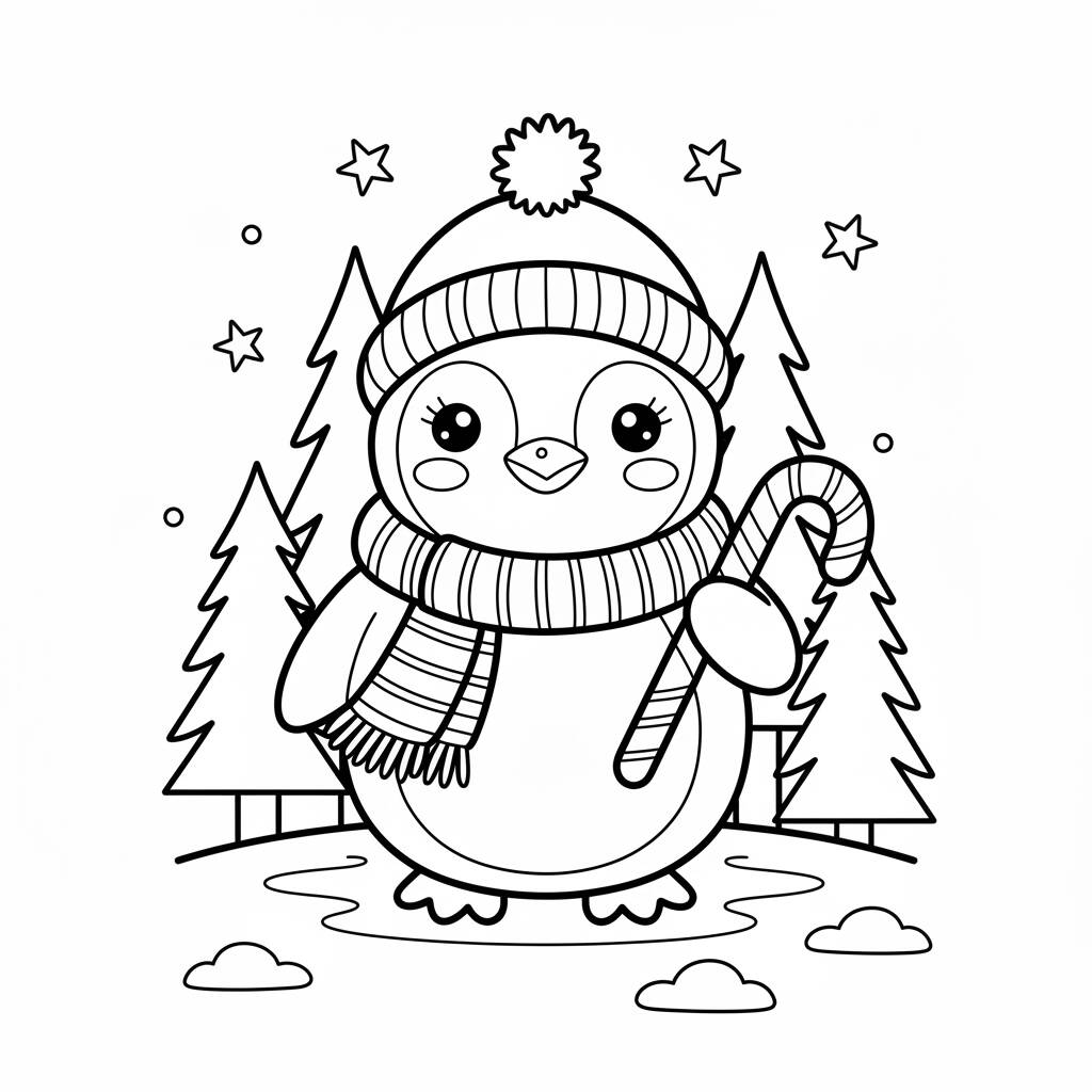 Uma divertida página de colorir de Natal com um adorável pinguim usando um gorro e cachecol, perfeito para as festas.