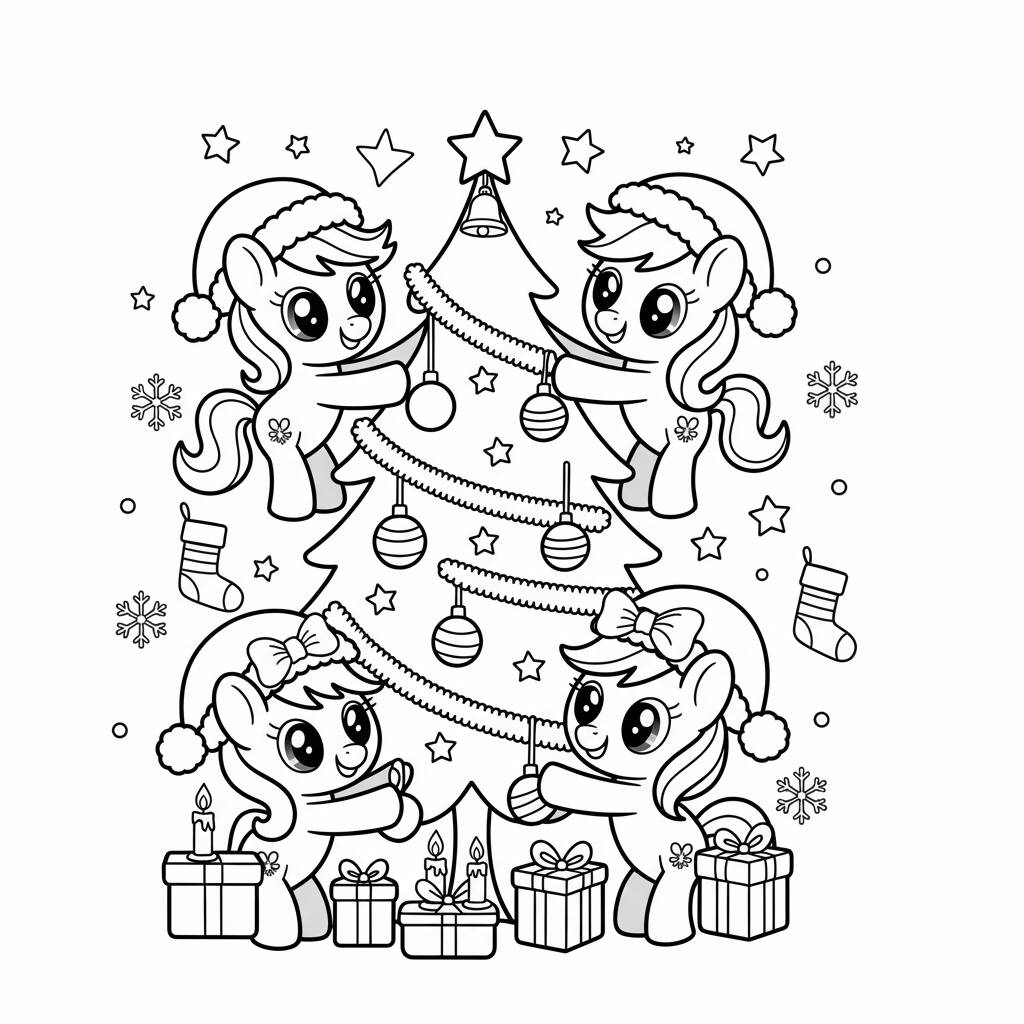 Coloração divertida com pôneis decorando a árvore de Natal, perfeita para crianças.