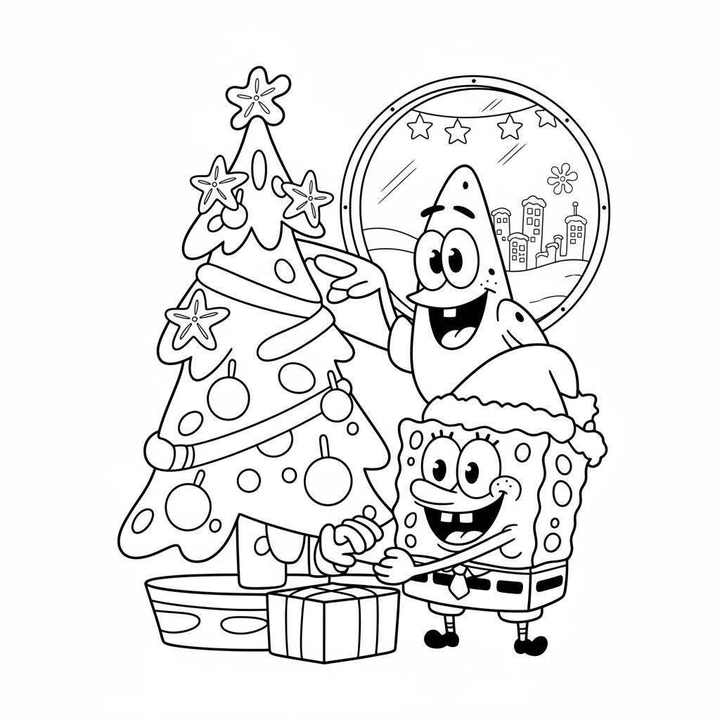 Colorir este divertido desenho do Bob Esponja e Patrick decorando a árvore de Natal.