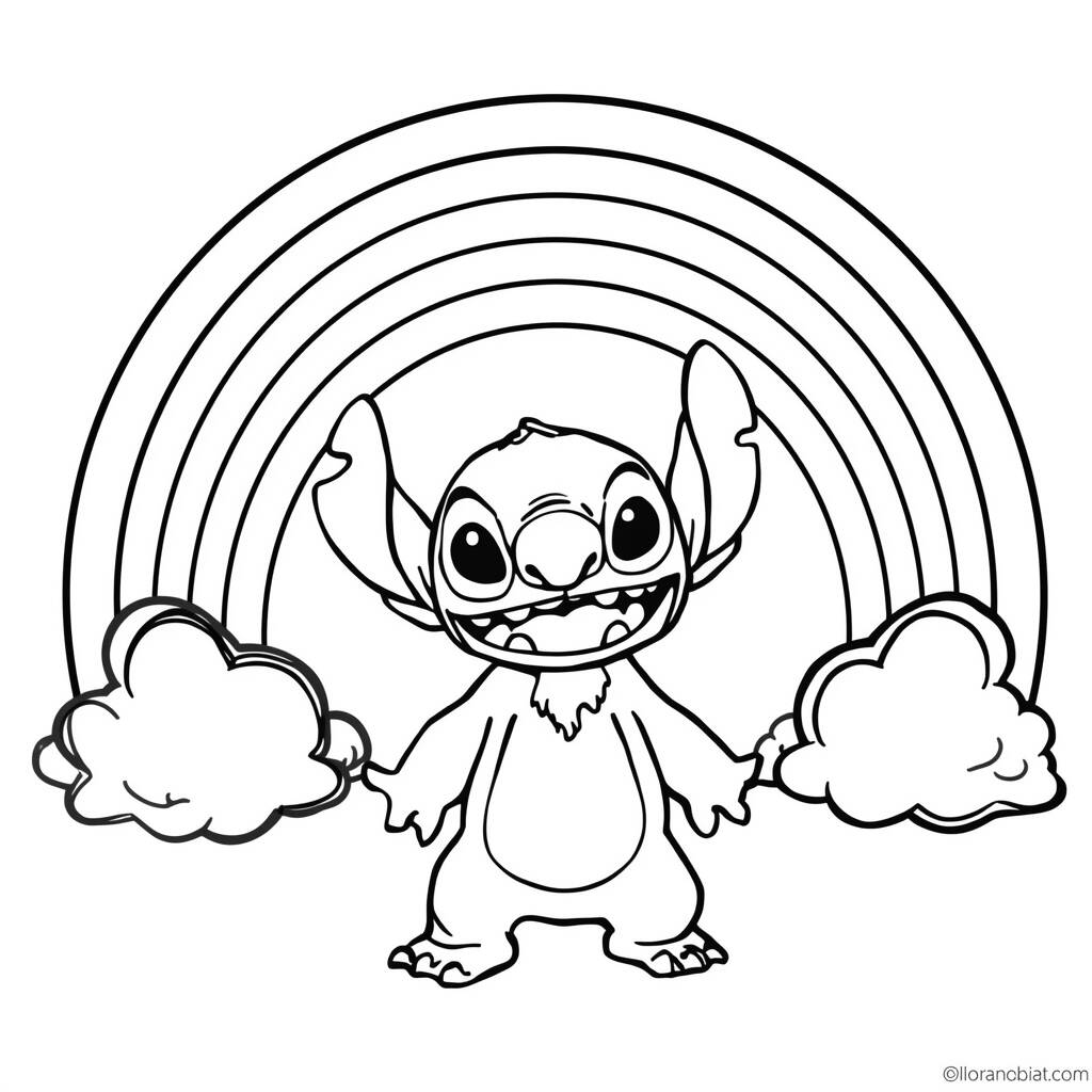 No desenho do Stitch sob um arco-íris, você pode começar colorindo o Stitch com seus tons icônicos de azul, acrescentando um azul claro para a barriga e um azul mais profundo para o corpo. O arco-íris pode ser preenchido com cores vibrantes como vermelho, laranja, amarelo, verde, azul e roxo, criando um efeito alegre e divertido. As nuvens ao fundo podem ser coloridas de um branco suave ou até mesmo em tons de cinza claro, para dar um contraste bonito com o arco-íris colorido.