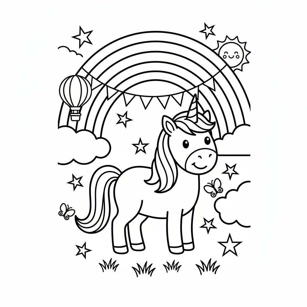 Uma divertida página de colorir com um unicórnio encantador, arco-íris e estrelas, perfeita para estimular a criatividade das crianças.