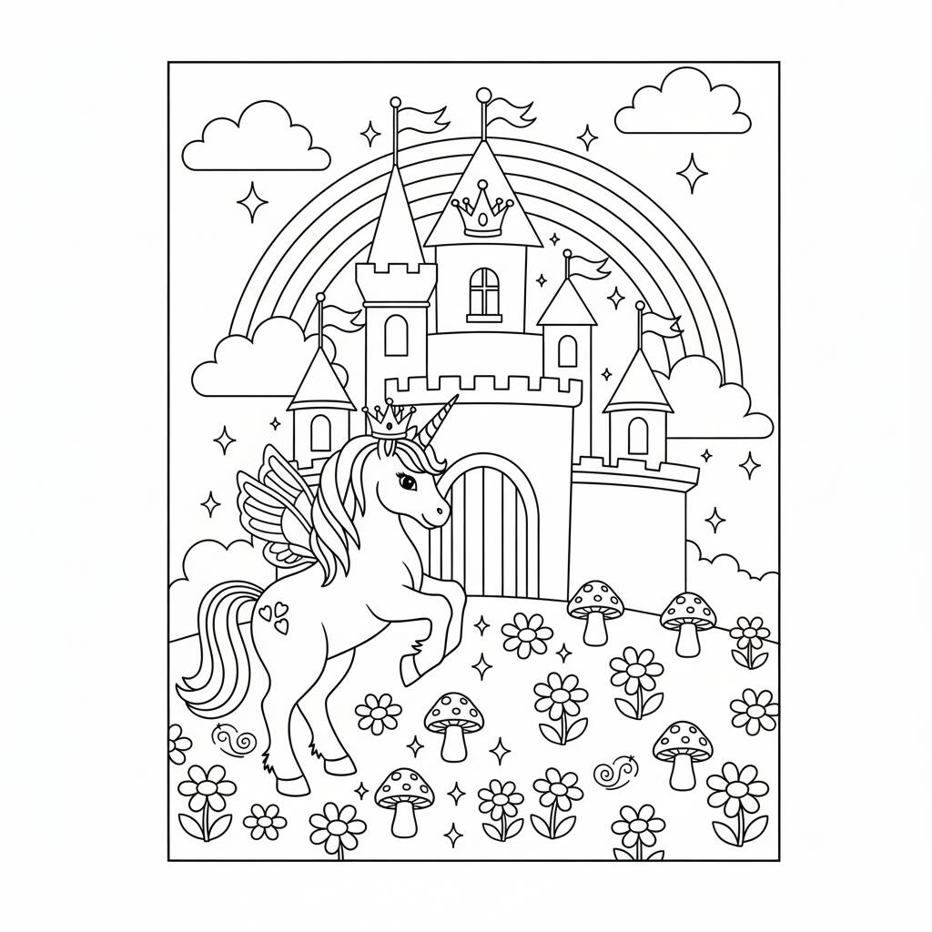 Uma divertida página de colorir com um unicórnio encantador, um castelo e um arco-íris, perfeita para crianças e amantes de unicórnios.
