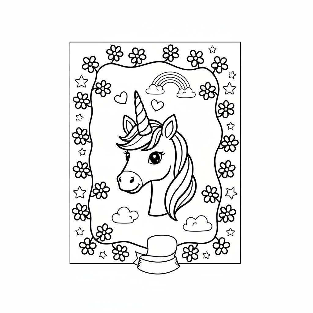 Uma divertida página para colorir com um unicórnio rodeado de flores e um arco-íris, ideal para crianças e amantes de unicórnios.