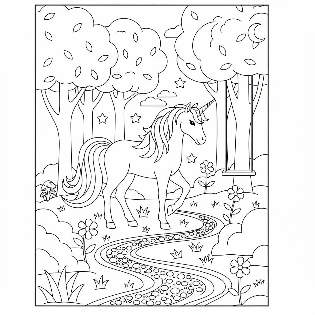 Uma linda página de coloração com um unicórnio em um cenário de bosque, perfeita para estimular a criatividade das crianças.