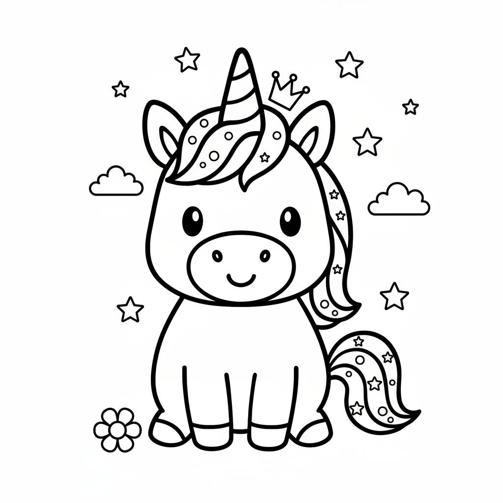 Uma encantadora página de colorir com um unicórnio adorável, ideal para crianças se divertirem e explorarem sua criatividade.