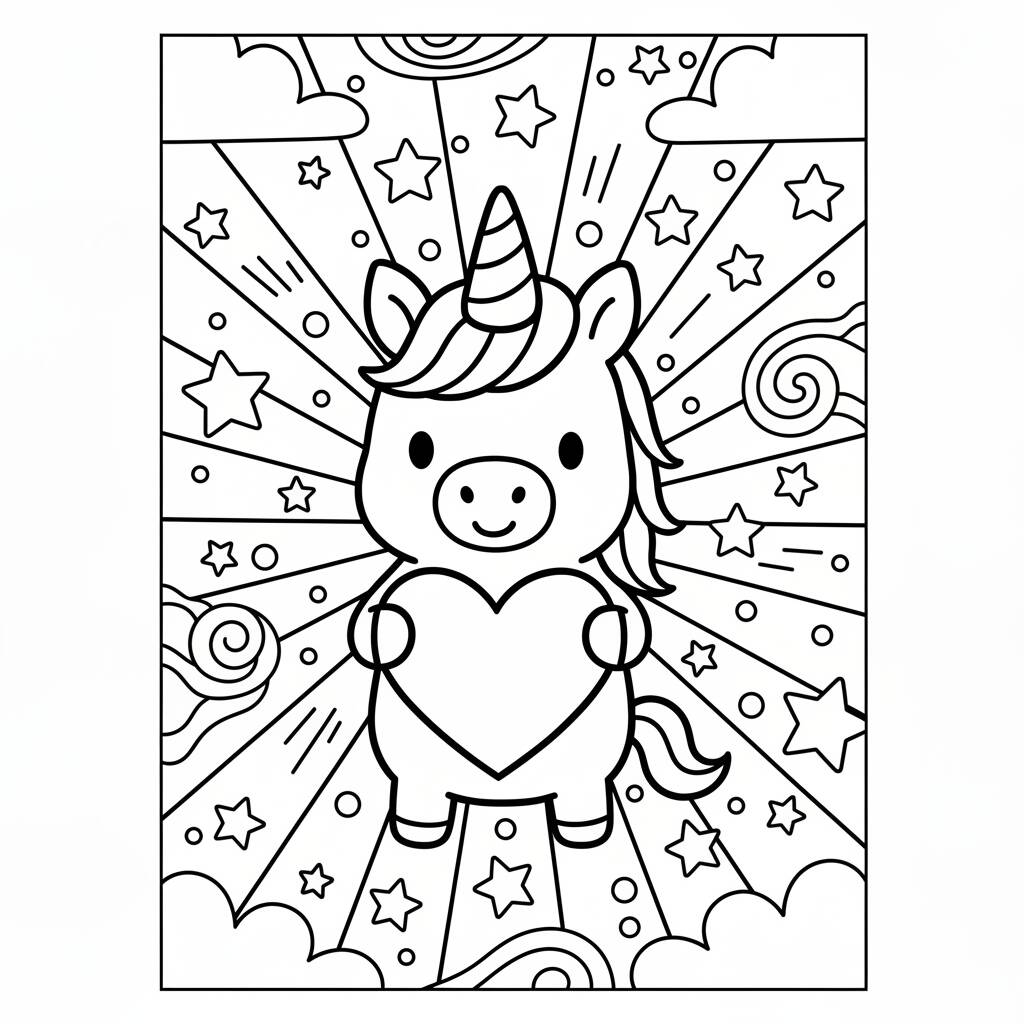 Uma divertida página de colorir com um unicórnio adorável segurando um coração, perfeita para estimular a criatividade das crianças.