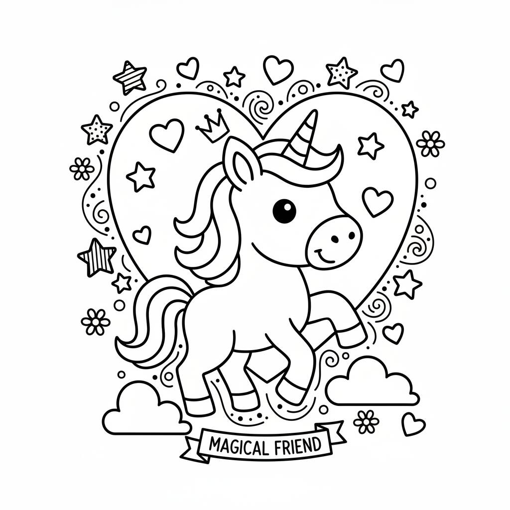 Uma divertida página de colorir com um unicórnio encantador e elementos mágicos.