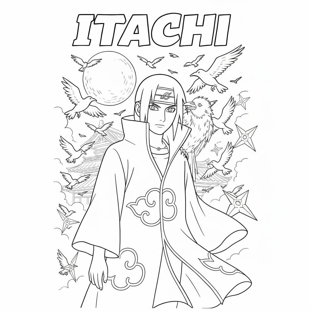 Página de colorir do Itachi, personagem icônico de Naruto, ideal para fãs e amantes de arte.