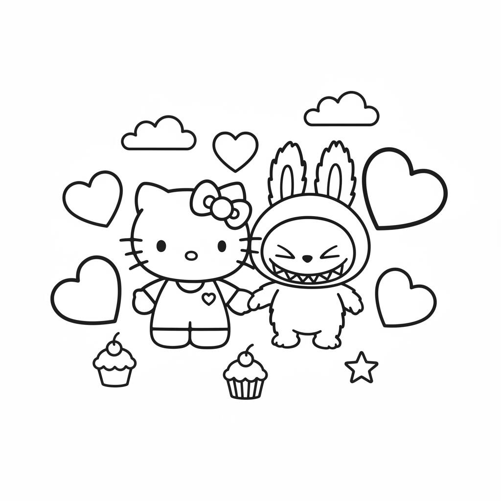 Uma divertida página de colorir com Labubu e Hello Kitty, perfeita para crianças que amam arte e criatividade.