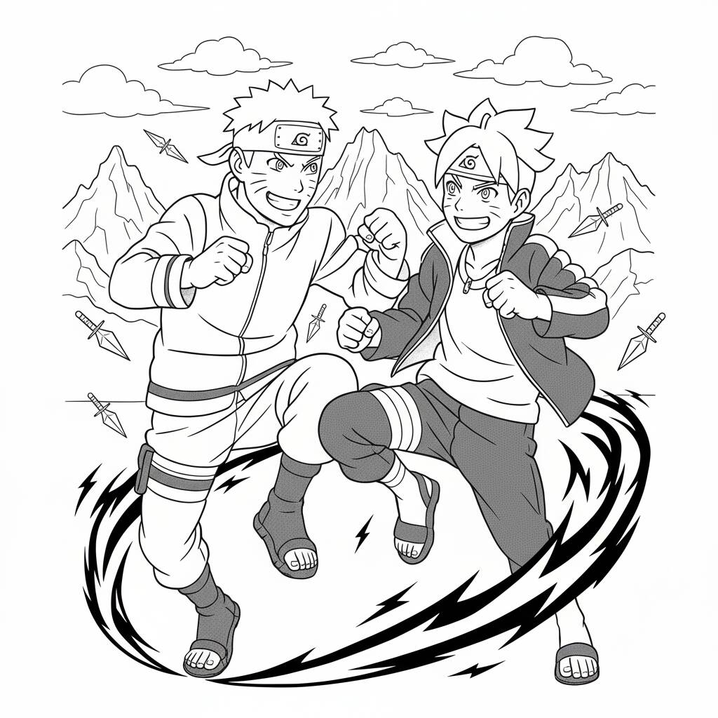 Página de colorir divertida com Naruto e Boruto prontos para a ação, ideal para fãs da série.