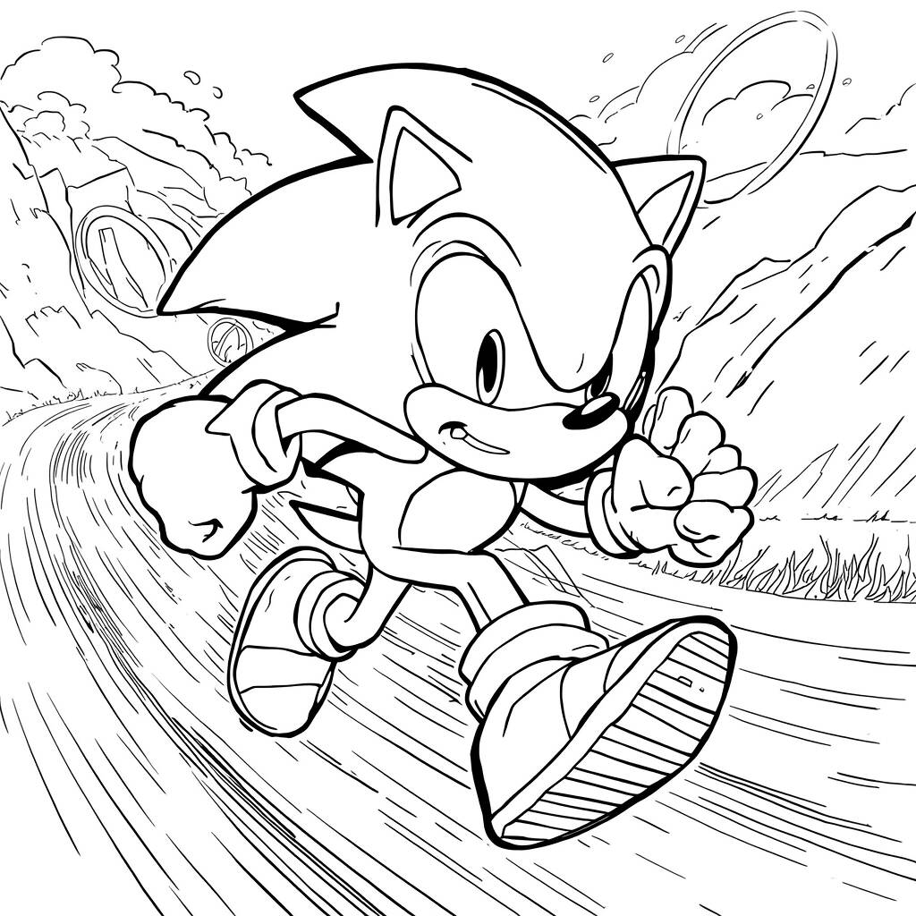 No emocionante desenho do Sonic para colorir, vemos o ouriço azul mais veloz do mundo correndo em alta velocidade, com uma expressão determinada no rosto. Ele está cercado por anéis dourados que flutuam ao seu redor, enquanto colinas verdes se estendem ao fundo, criando um cenário vibrante e dinâmico. As linhas do desenho em preto e branco permitem que a imaginação ganhe vida com cores diversas, e cada detalhe convida as crianças a mergulharem no mundo de aventuras do Sonic.