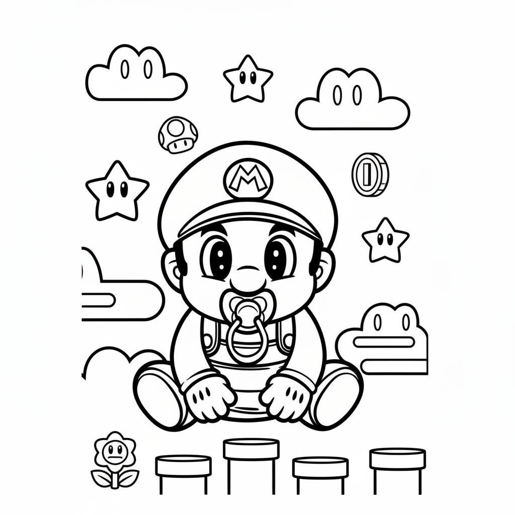 Um divertido desenho do Super Mario Bebê rodeado de elementos icônicos para colorir.