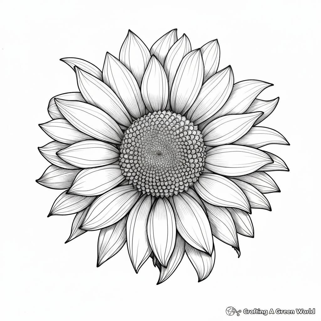 Uma bela página de colorir com um desenho detalhado de um girassol, ideal para relaxar e estimular a criatividade.