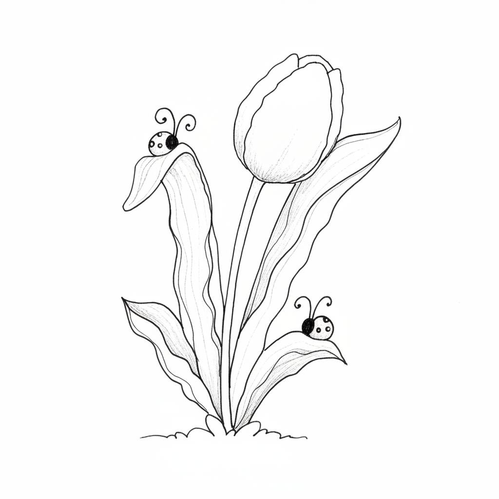 Uma divertida página de colorir com uma flor de tulipa e joaninhas, perfeita para estimular a criatividade das crianças.