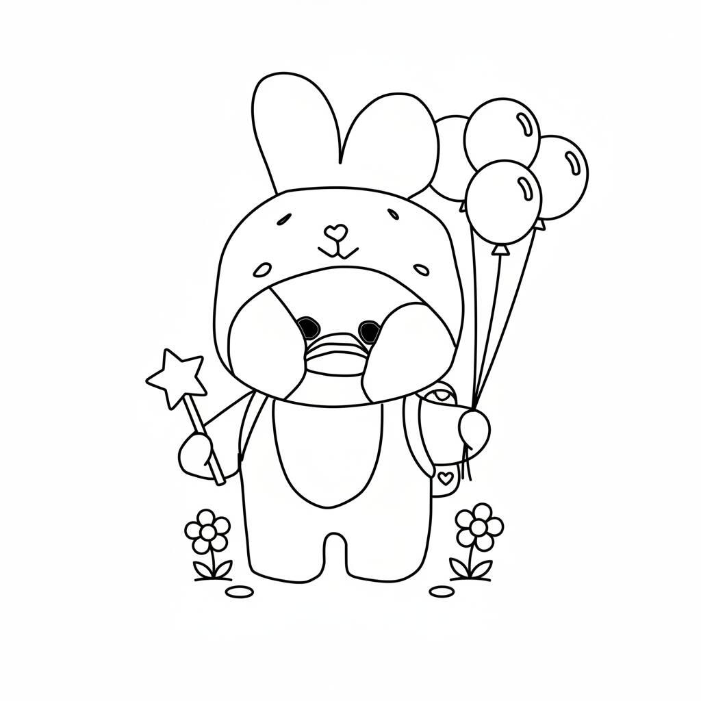 Uma divertida página de colorir do Paper Duck, apresentando um personagem adorável segurando balões e uma varinha mágica, perfeita para crianças.