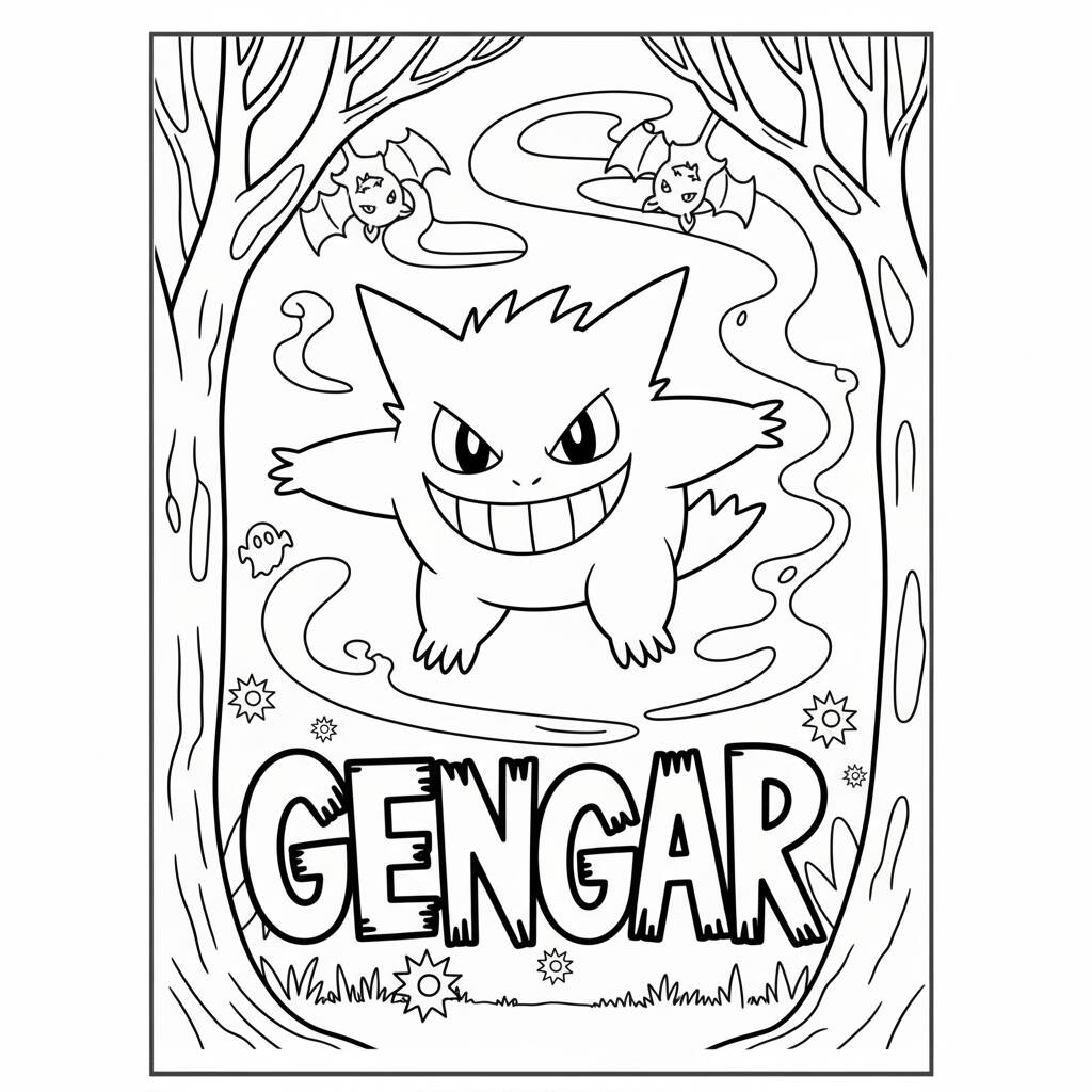 Uma divertida página de colorir do Pokémon Gengar, perfeita para os fãs de todas as idades.
