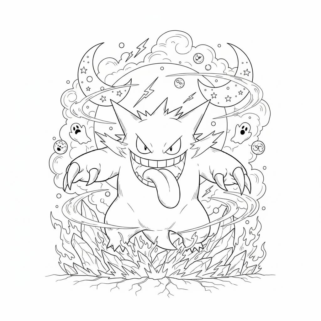 Página de colorir do Pokémon Gengar, perfeita para os fãs de Pokémon que adoram arte e criatividade.