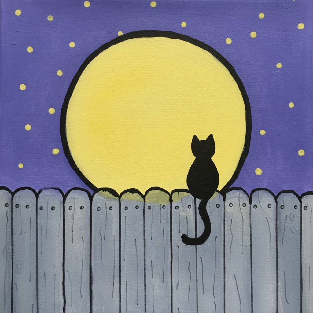 Uma divertida página de colorir de um gato sob a lua cheia, ideal para crianças e adultos que amam a arte.