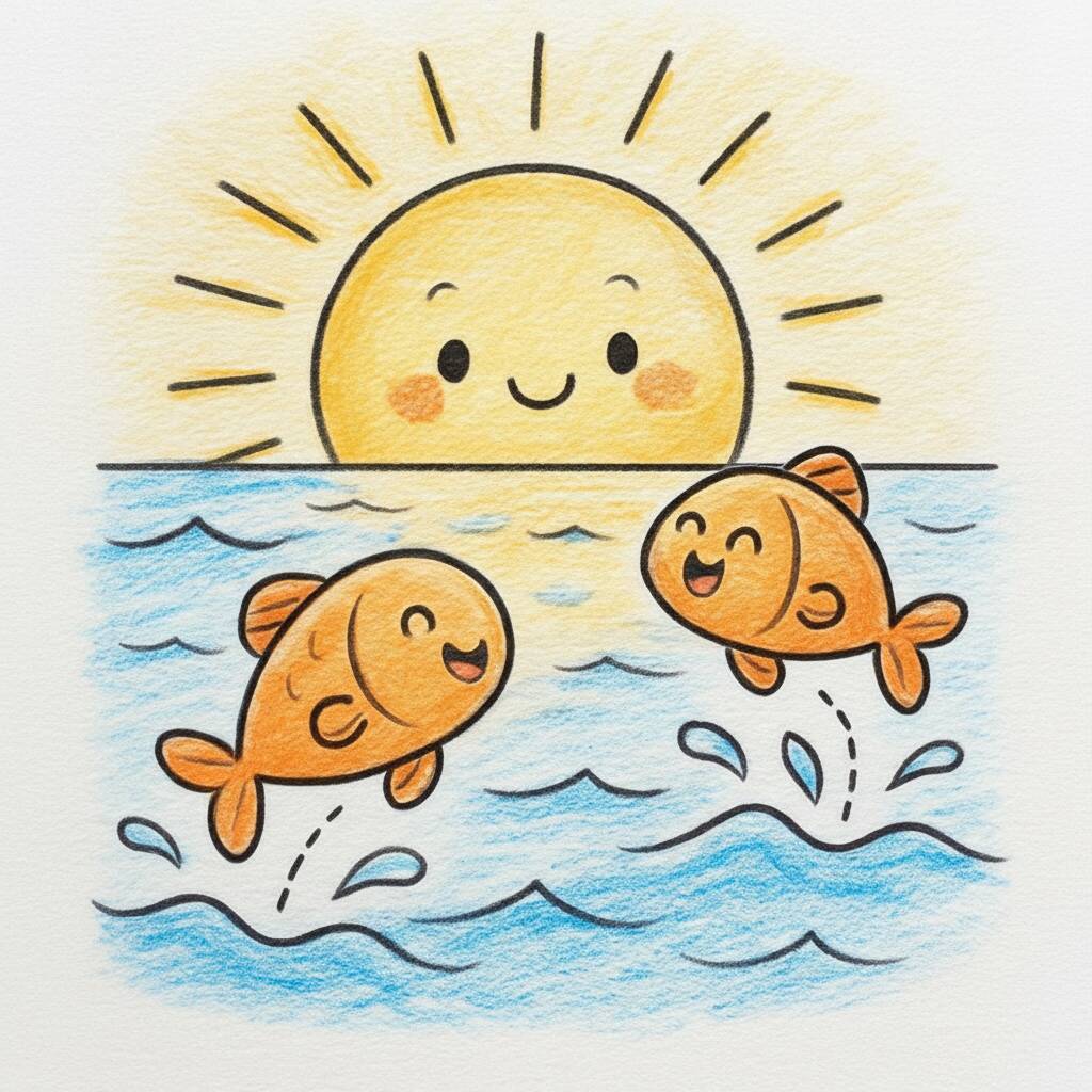 Uma ilustração alegre de peixes saltando na água com um sol sorridente, perfeita para colorir.